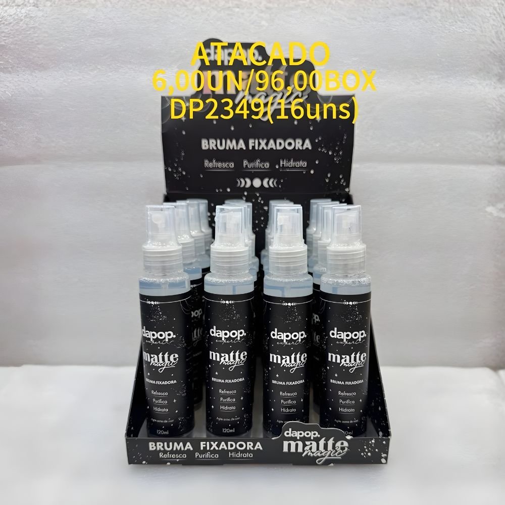 A Bruma Fixadora Matte Magic da Dapop (código DP2193) é o segredo para uma pele sequinha, acabamento impecável e maquiagem que dura o dia todo. Sua fórmula inovadora absorve oleosidade, controla o brilho e proporciona efeito matte com toque confortável — ideal para revenda.